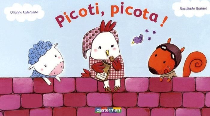 • Picoti picota ! La comptine de la poule sur un mur est reprise et prolongée dans cette histoire drôle et rythmée. Une petite phrase se répète à la fin chaque page que les enfants apprennent très vite par cœur et qui leur permet d’être actif dans la lecture.